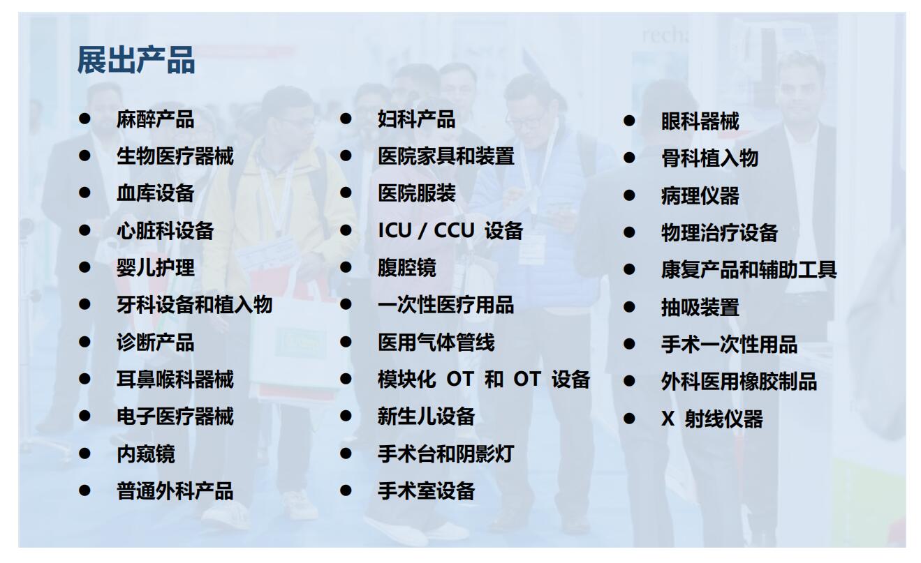 麻醉產品、生物醫(yī)學儀器、血庫設備、心臟病設備、嬰兒和嬰兒護理、牙科設備和植入材料、診斷產品、E.N.T 儀器、電子醫(yī)療儀器、內窺鏡、常規(guī)外科產品、婦科產品、醫(yī)院家具及固定裝置、醫(yī)院服裝、ICU / CCU 設備、腹腔鏡、醫(yī)療一次性用品、醫(yī)用燃氣管道、模塊化 OT 和 OT 設備、新生兒器械、手術臺和陰影燈、手術室設備、眼科儀器、骨科植入物、病理儀器、理療設備、康復產品和輔助工具、抽吸設備、一次性手術用品、外科醫(yī)用橡膠制品、X 射線儀器、認證機構等。