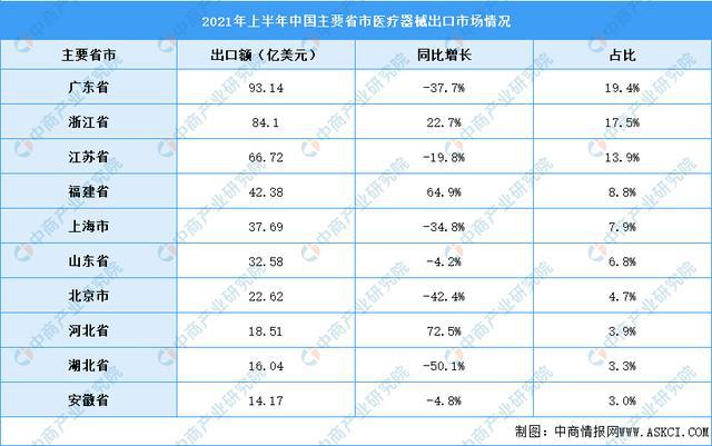 從全國(guó)出口海關(guān)口岸的貿(mào)易數(shù)據(jù)來(lái)看,廣東省是我國(guó)醫(yī)療器械出口額最高的省份,2021年上半年出口額達(dá)到93.14億美元,全國(guó)占比19.4%;其次為浙江?。?4.10億美元)和江蘇省(66.72億美元)。另外,河北省、福建省增幅明顯,分別為72.5%和64.9%。