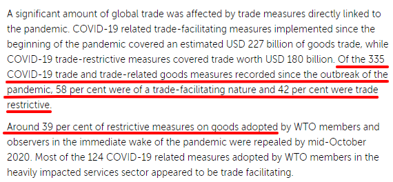 WTO成員自疫情發(fā)生后共采取了335項(xiàng)有關(guān)貨品貿(mào)易措施,其中58%為促進(jìn)措施,42%為限制措施,分別涉及2270億美元及1800億美元的貿(mào)易額。從新冠大流行至2020年10月,有39%的貿(mào)易限制措施被廢除。