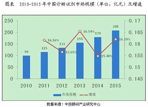 在我國體外診斷市場中,診斷試劑占據(jù)絕大部分份額,占比高達(dá)80%,在這當(dāng)中,生化診斷試劑和免疫診斷試劑市場是最大的兩個市場,合計占市場份額的60%。2015年診斷試劑行業(yè)市場規(guī)模突破200億元大關(guān),達(dá)到208億元,過去五年行業(yè)年均增速高達(dá)16%。