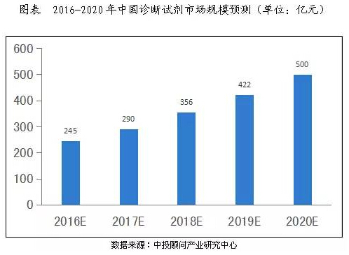 導(dǎo)讀:診斷試劑行業(yè)在整個體外診斷市場中占比重,中投顧問產(chǎn)業(yè)研究中心預(yù)測,未來幾年體外診斷行業(yè)年均增速會在15%左右,診斷試劑增速會略高于體外診斷整體市場,年增速預(yù)計會在15%-20%左右,2020年行業(yè)規(guī)模有望突破500億元。